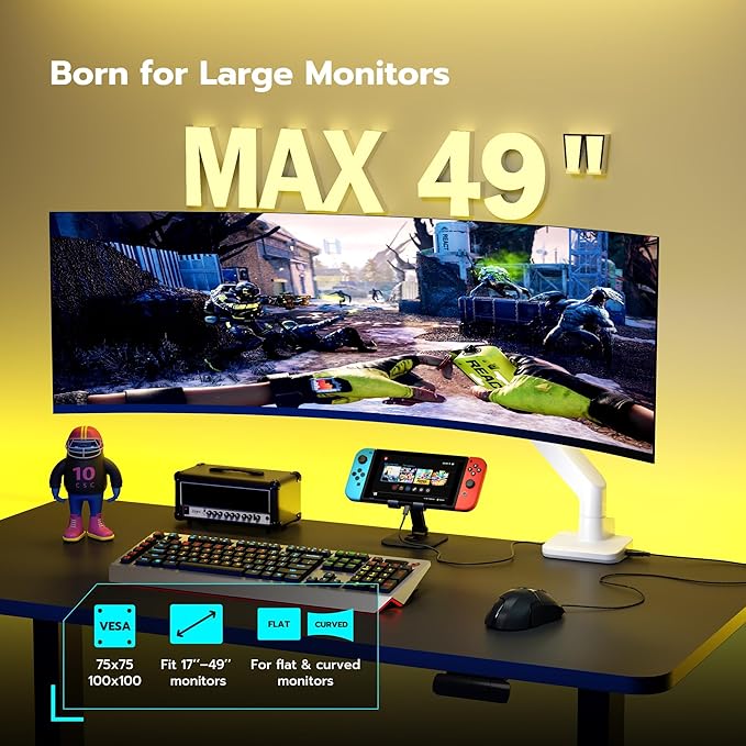 【Support up to 49″ & 44lbs Monitors】The ARES WING single monitor arm has an optimized tilt structure, provides excellent weight-bearing capacity for ultra wide screens, including most of the popular 49″ ultrawide flat and curved computer monitors. With a max. weight capacity of 44 lbs, it can securely support 17″-49″ monitor, and compatible with VESA 100×100 and 75x75mm. If your monitor does not have a VESA hole, you need to prepare a VESA mount adapter.